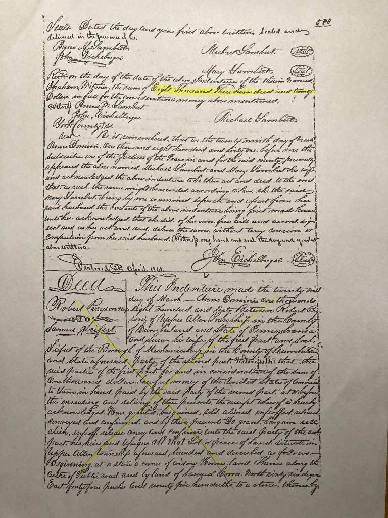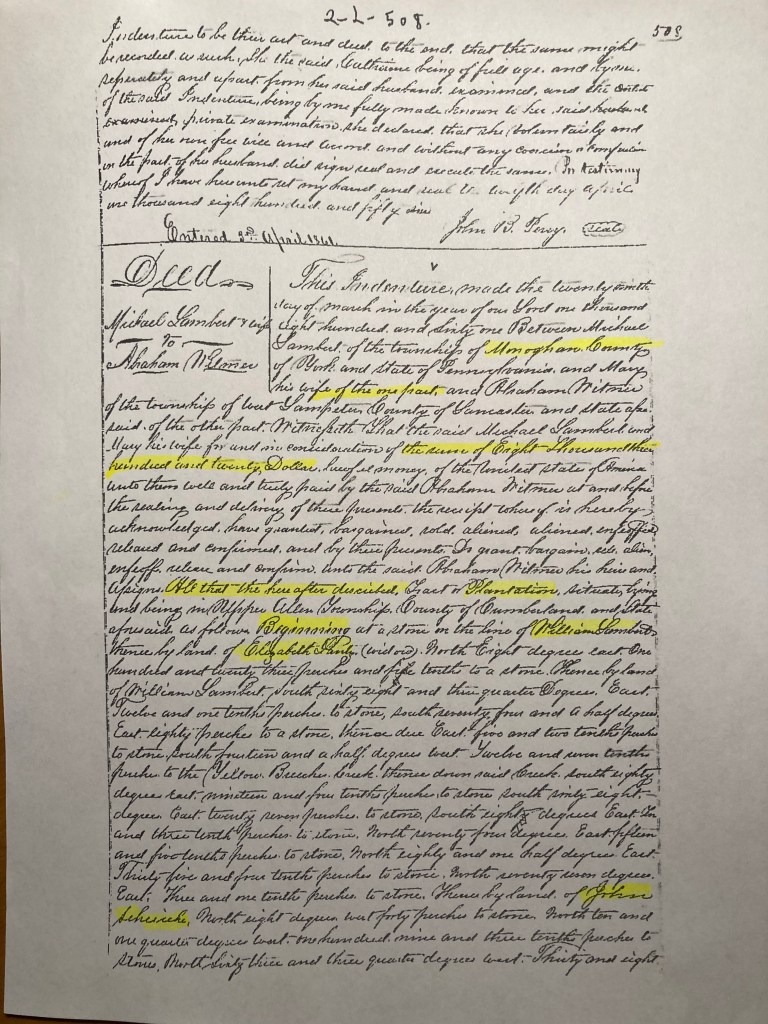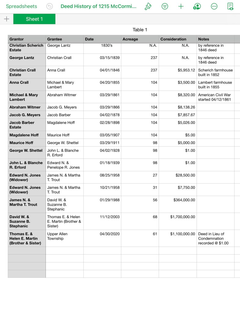 A professional abstractor has traced the Deed records of 1215 McCormick Rd. to 1846 and, by reference, 1839. This is as far back as deeds go in the Cumberland County Recorder of Deeds office. Obtaining the names of all prior owners is recommended by a local historian as part of preparing a Historic Resource Survey Form on the property.