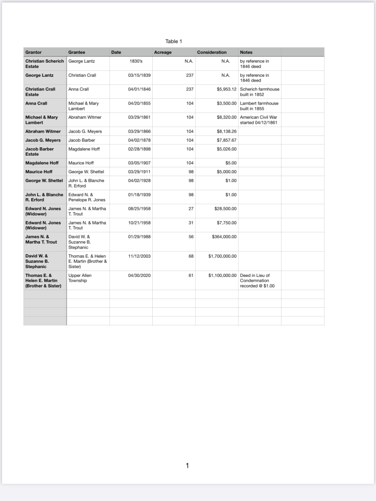 The deeds prior to 1939 are all handwritten and most are difficult to decipher. The farm went through several Estate and Sheriff sales in its history which make for lengthy deed references. The latest deed from Thomas, Barbara and Helen Martin to Upper Allen Township, reads “Deed In Lieu Of Condemnation”. Township Commissioners have said this was done to save on transfer taxes and that the consideration was $1,100,000.00.