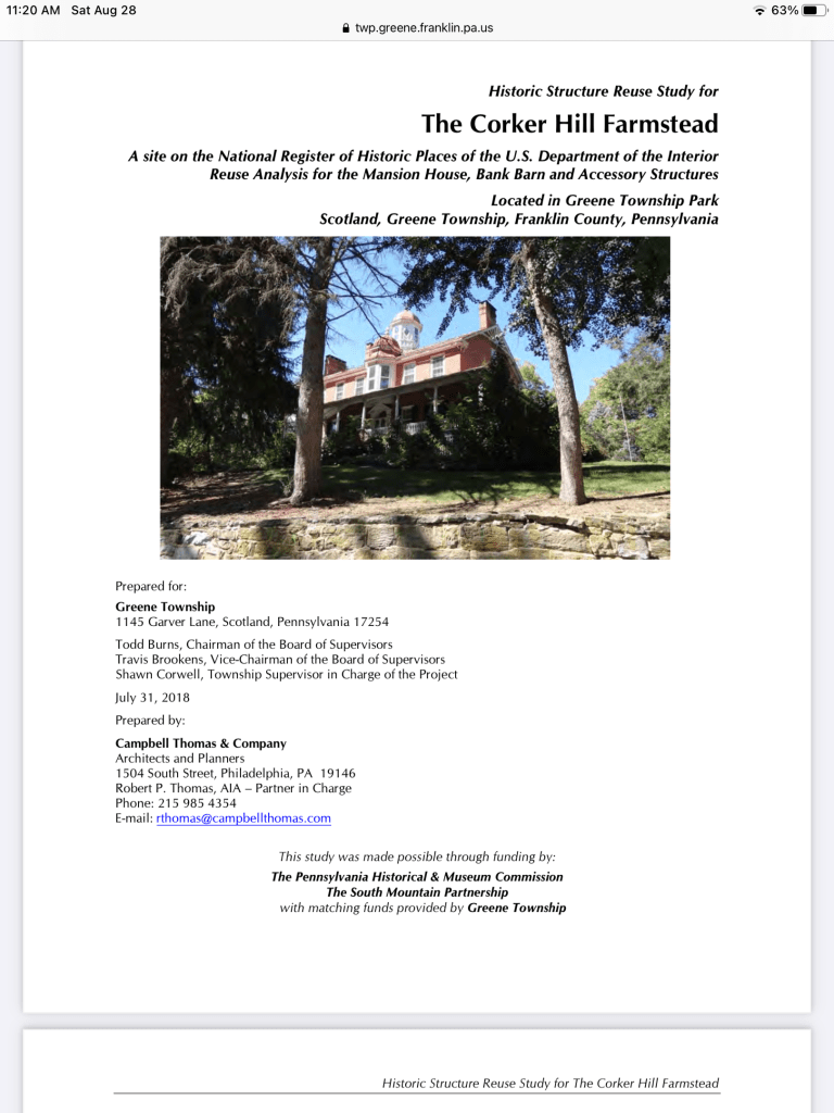 One additional “case study” for a farm/park that has come to our attention is Corker Hill Farm in Greene Township, Franklin County. This is a 35 acre farm with 1810-20 Mansion House and mid to late 19th century stone end Bank Barn on the National Register of Historic Places which received a grant from The Pennsylvania Historical & Museum Commission and The South Mountain Partnership for a “Historic Reuse Study”. The study may be found at https://www.twp.greene.franklin.pa.us/wp-content/uploads/2020/11/Corker-Hill-Reuse-Study-for-Website.pdf