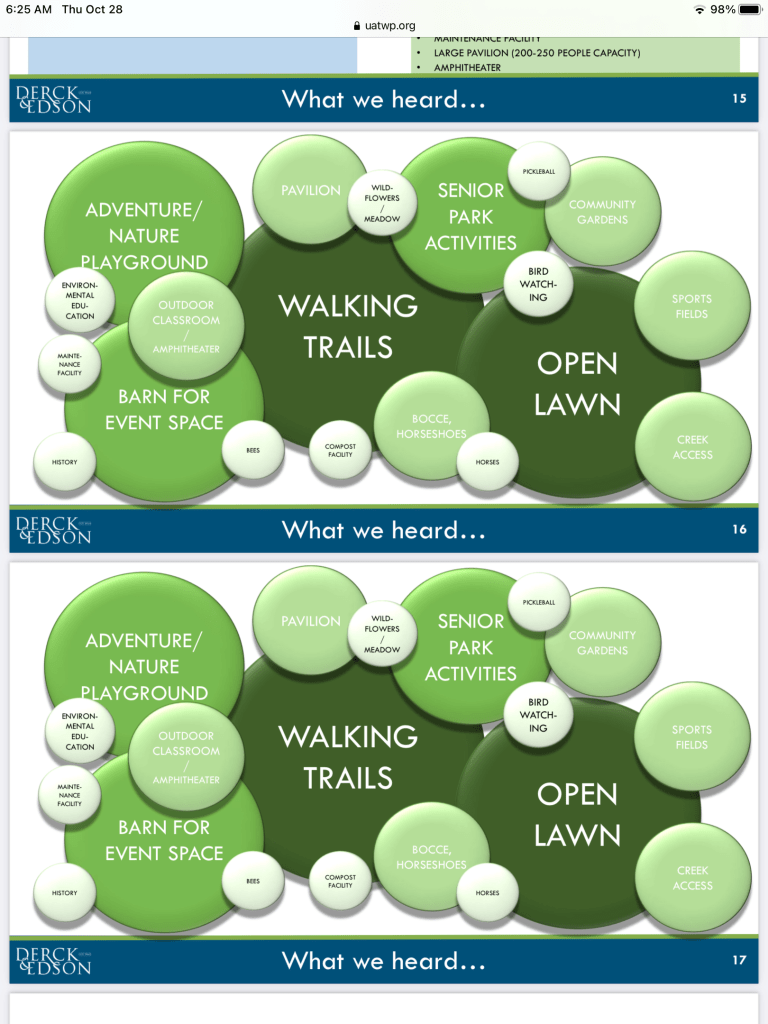 We attended the Park & Recreation Board (“P&R”) meeting last Wednesday (08/25/21) and asked its members to state their views on the farm/park project since they were understood to have recently shared their views with Derck & Edson, the consultant hired by UAT to prepare a Master Plan for the property. We think it important to have a sense of where the P&R Board members stand. Members are appointed by the Commissioners and serve five (5) year terms.