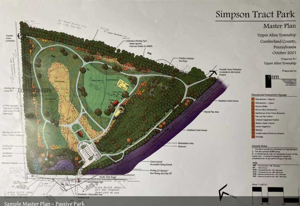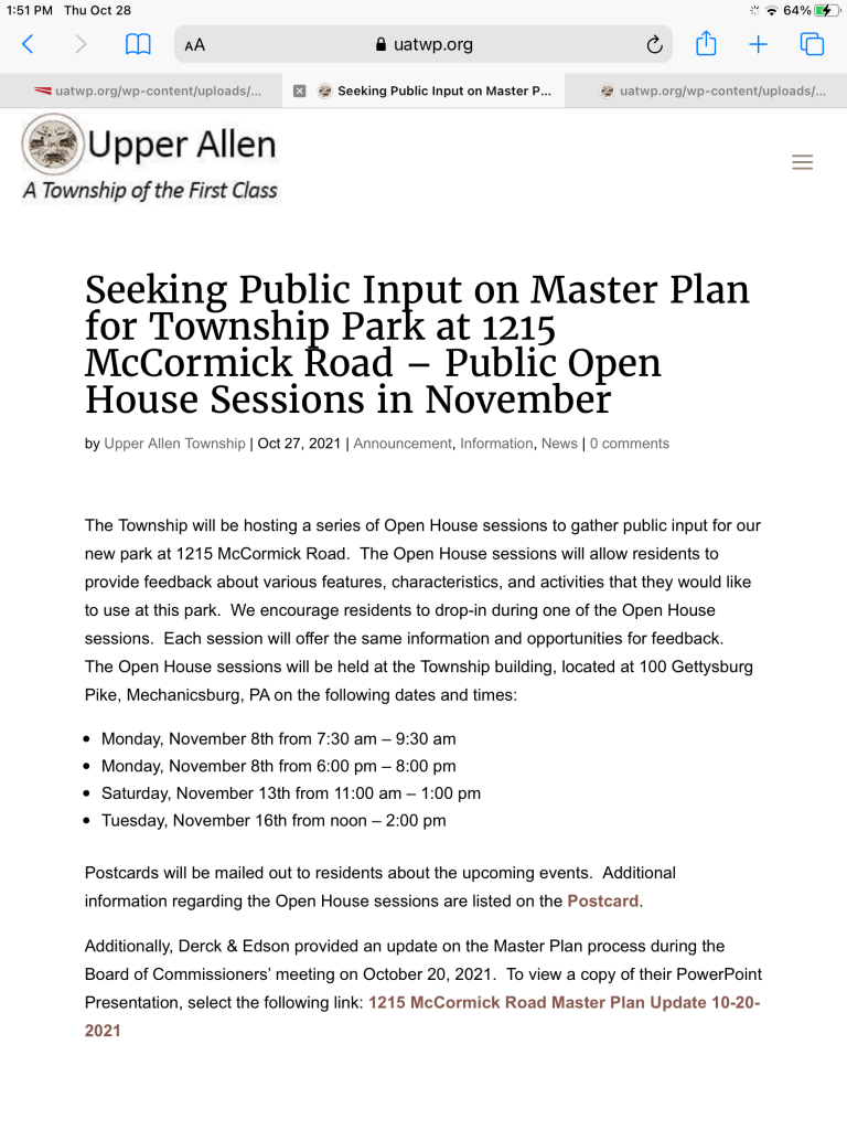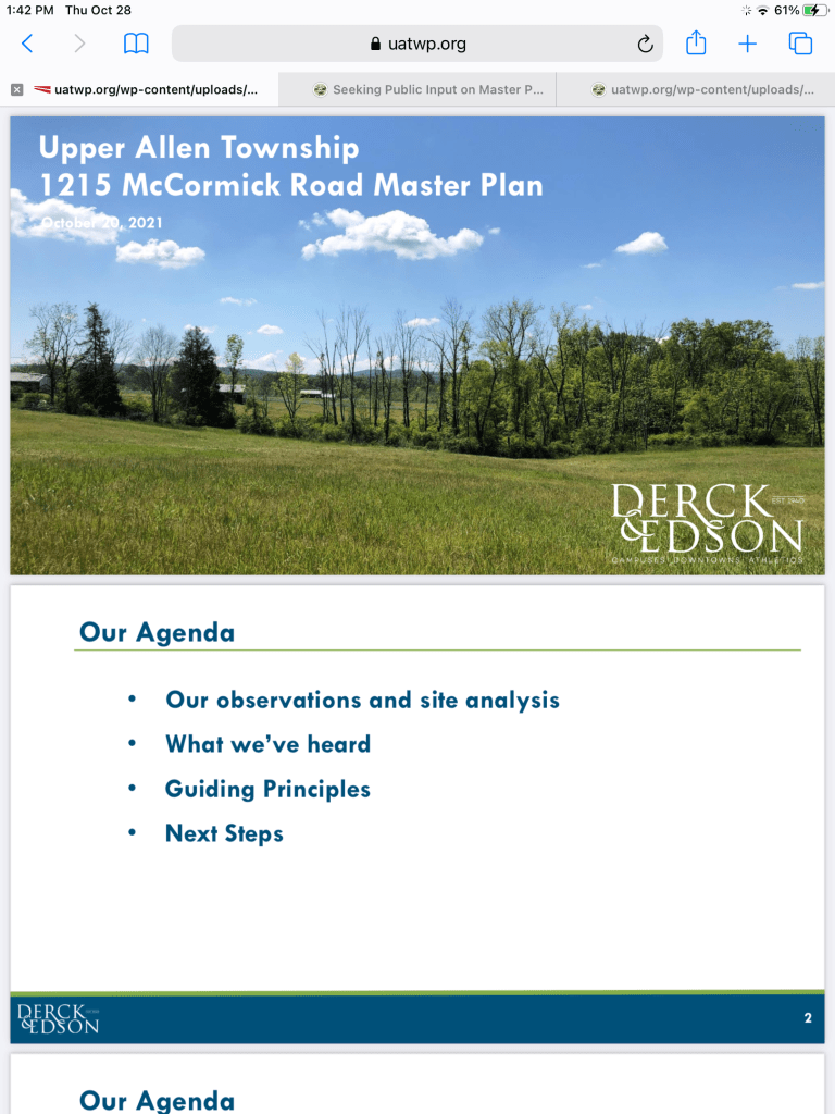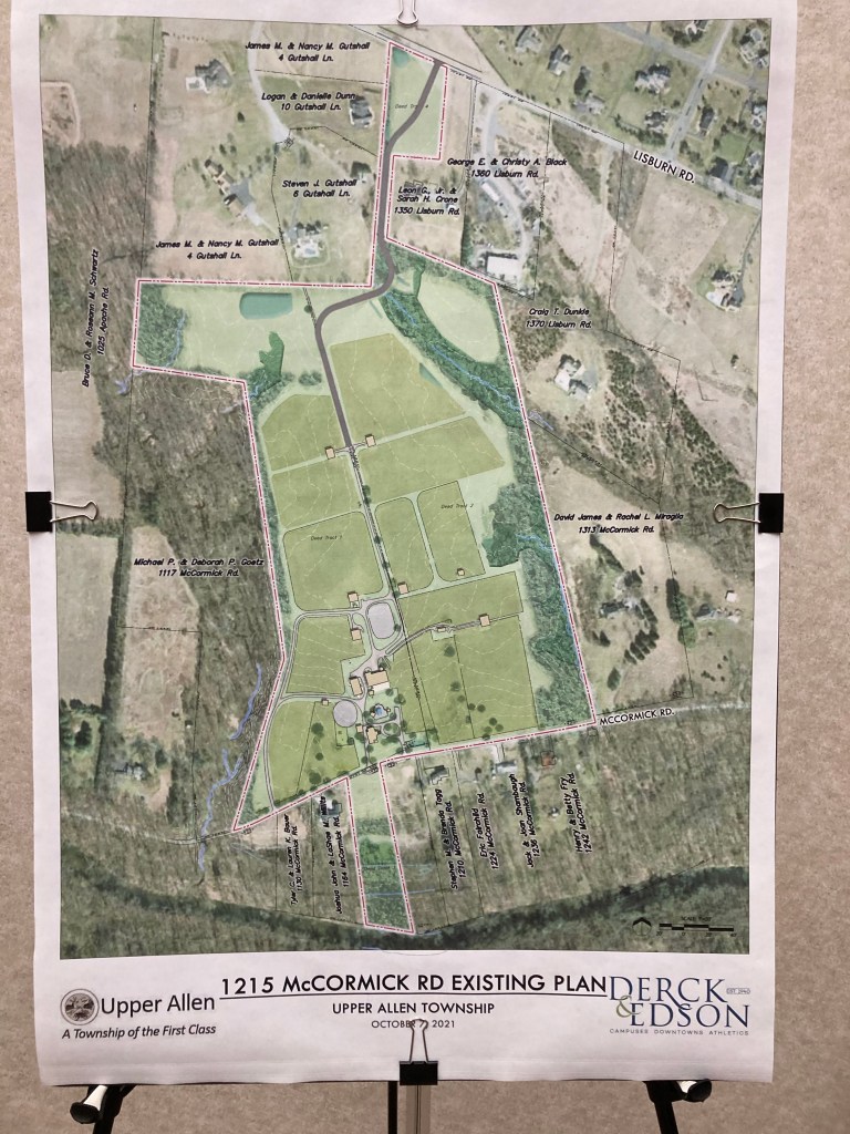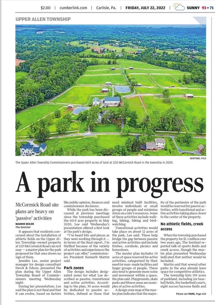 Derck & Edson, the consultant hired by Upper Allen Township to develop a Master Plan for the 61 acre farm at 1215 McCormick Rd. will be presenting its plan at the July 20, 2022 Board of Commissioners (BOC) Meeting. Please mark your calendar and plan to attend this important meeting. This is where “the rubber meets the road”. Meetings start at 6:30 PM at the Municipal Building at 100 Gettysburg Pike.