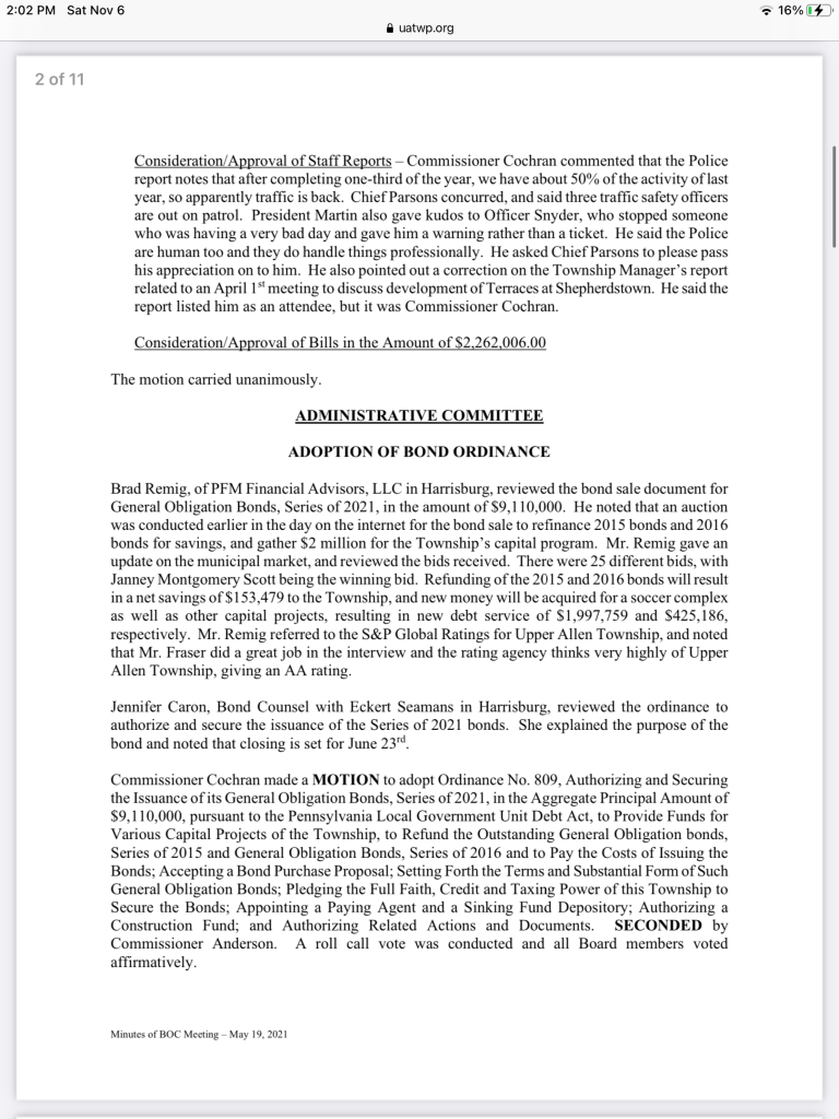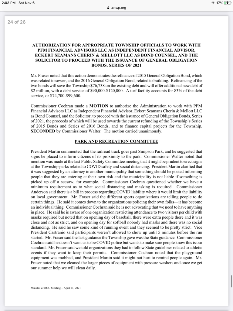 A more detailed summary of the P&R discussion will be available when minutes of the 08/25/21 meeting are (hopefully) released next month. Agendas and Minutes are available online at the Township’s website. This leads us to our next update item.