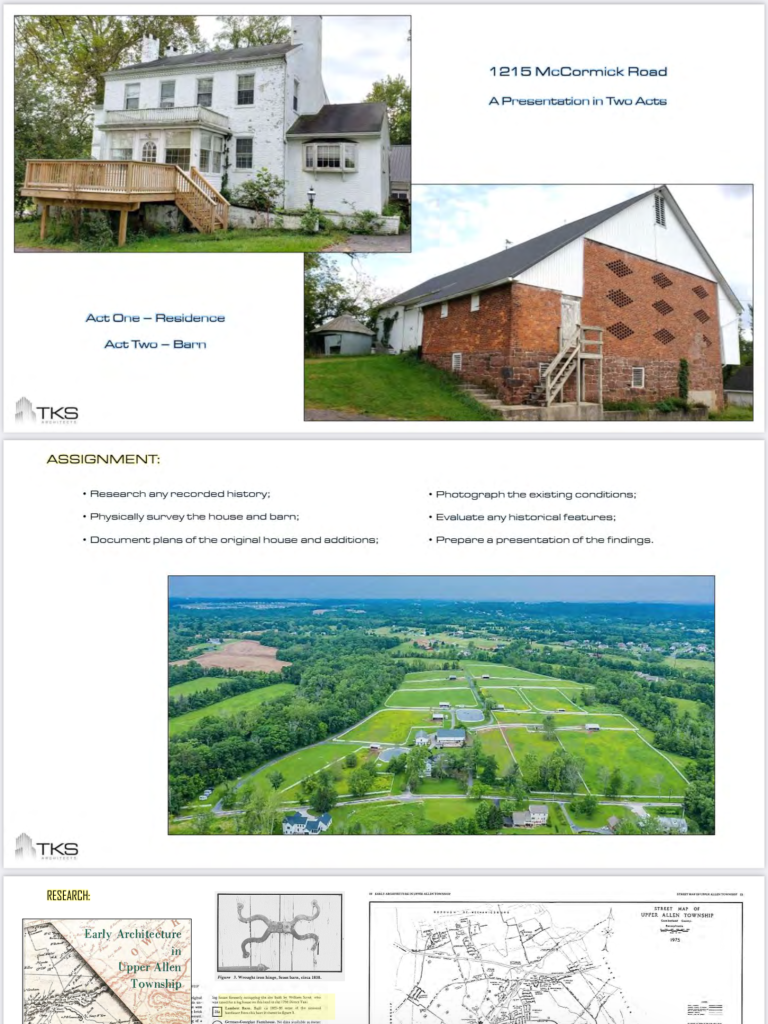 We have been talking with several historic, preservation, conservation and planning professionals who would like to have a tour of the farmland, farmhouse, barn, and other outbuildings at 1215 McCormick Rd. The interested parties are with the Cumberland County Planing Office, Cumberland County Historical Society, West Shore Historical Society and The South Mountain Partnership. We also suggest members of the Upper Allen Township Historic Architecture Review Board be included.