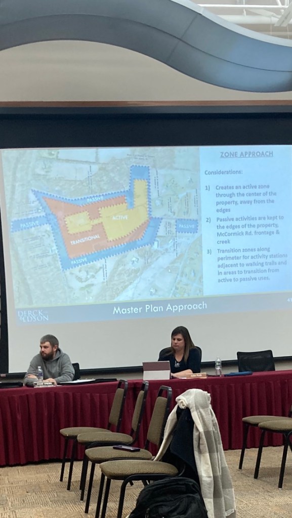 “Concerns” that have been raised are increased traffic on McCormick Rd., creek access, destruction of historic and natural features, extensive earth moving, loss of habitat, separation of uses, buffers, active uses that conflict with a passive theme, and activities that require large parking areas.