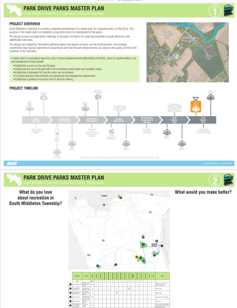 When South Middleton Township recently approved its Master Plan for Park Drive, Supervisor Chairman Bryan Gembusia said “Having this plan in place helps us to get state and federal grants so that we can implement this. It also allows us to create a development that isn’t all discombobulated.” See: