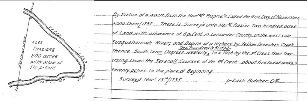 We believe, but have not yet confirmed, that Red Stone Creek is the creek or stream on the West side of the farm between it and the current Goetz property. There were few landmarks or roads in 1769 to determine a property location, so it made sense to use creeks as the reference point. This descriptive method is found throughout the Blunston Licenses, 1733/34 for Lancaster (now Cumberland) County. The trail from Eastern, Pennsylvania to the then Western frontier ran along the Yellow Beeches or Yellow Britches as it was called back then. As some neighbors along McCormick Rd. can attest, Indian artifacts can be found in this area along the Yellow Breeches.