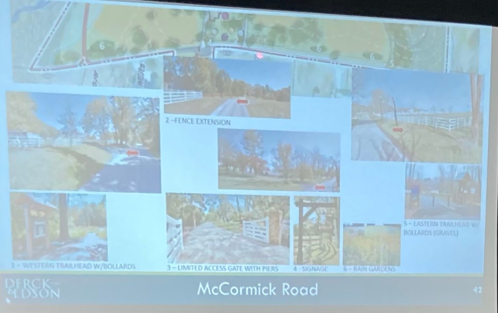 Eric Fairchild (of 1224 McCormick Rd.) said the main (design) concern he has is what type of parking is envisioned, how many spaces, would it be centered in one place and would it require roadways to other areas? President Martin said there would be pockets of parking because it is such a big area, that is just an idea as he is not a designer. Mr. Fairchild said he counted 200 spaces at Winding Hill Park. Commissioner Cochran said that Winding Hill Park is an active park set up for use of fields and that he would not expect to see that type of parking at McCormick.
