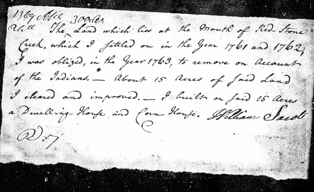 “The land which lies at the mouth of Red Stone Creek, which I settled on in the year 1761 and 1762, I was obliged in the year 1763 to remove on account of the Indians – about 15 acres of said land I cleared and improved – I built on said 15 acres a dwelling house and barn house.”