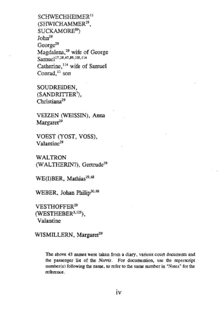 One of the original Schurch immigrants, K(C)asper Schirch is a historically significant figure for having survived the 1732 voyage of the Love & Unity. Like the Indians as original owners, the voyage of the Love & Unity was anything but – 98 of the original 156 passengers perished during the voyage as a result of alleged brutality (starvation) and murder on the part of British Captain Jacob Lobb. Casper Schirch’s first wife and child were among the dead. While we have yet to confirm it, we believe Casper Schirch was either the father or uncle of Christian Scherich who would later own the farm on McCormick Rd.
