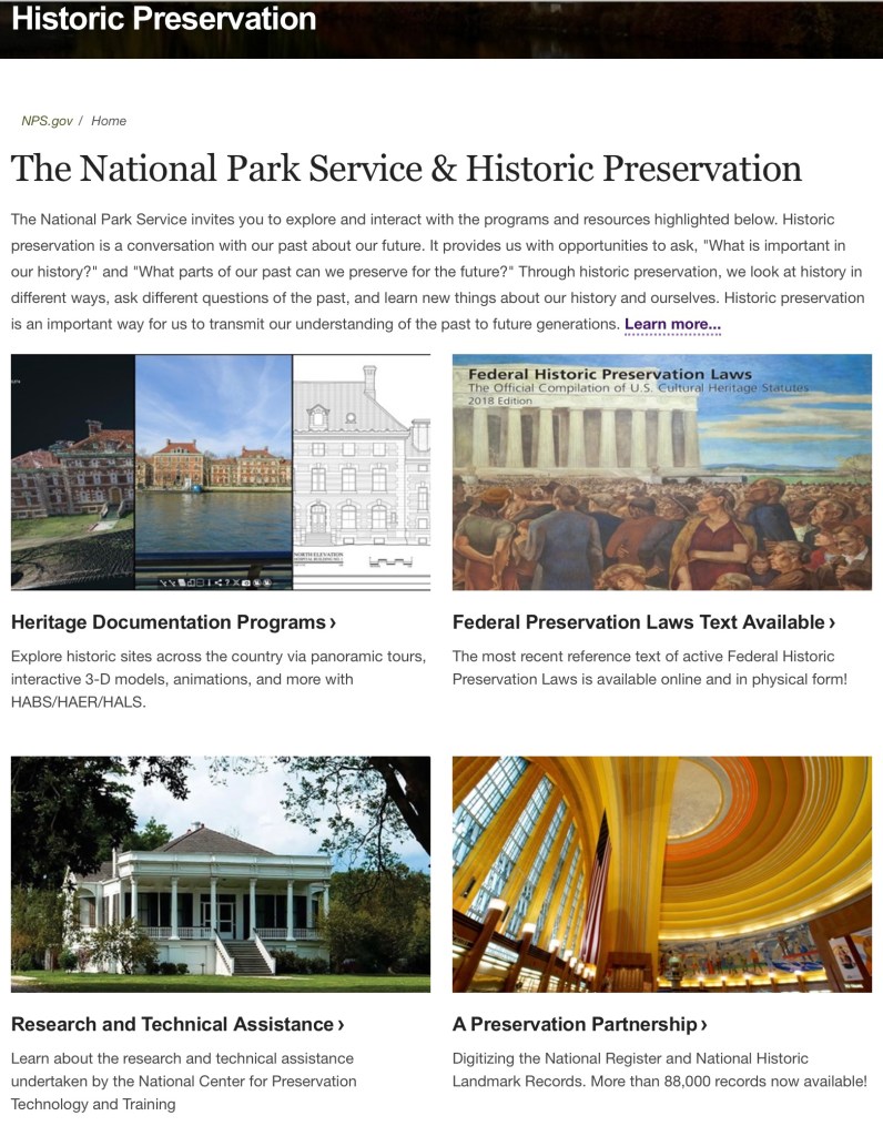 Within the National Park Service, many people work in historic preservation: archeologists, architects, curators, historians, landscape architects, and other cultural resource professionals. The National Park Service carries out historic preservation both within and outside the National Park System.”