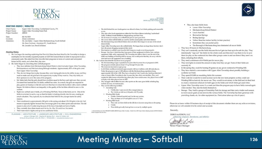 In studying the 128 page Derck & Edson master plan (not shown on the township website), one can read (on page 126) meeting minutes from an August 18, 2021 interview where Sean Cochran discusses Keystone Soccer’s “struggle with facilities” and “their wish list would be to send lacrosse out to the new farm property so they could use Winding Hills exclusively for soccer use”. At the time of the 2021 interview, the Keystone program was “up to 1,300 athletes with the Mechanicsburg population being approximately 420 of the 1,300”.