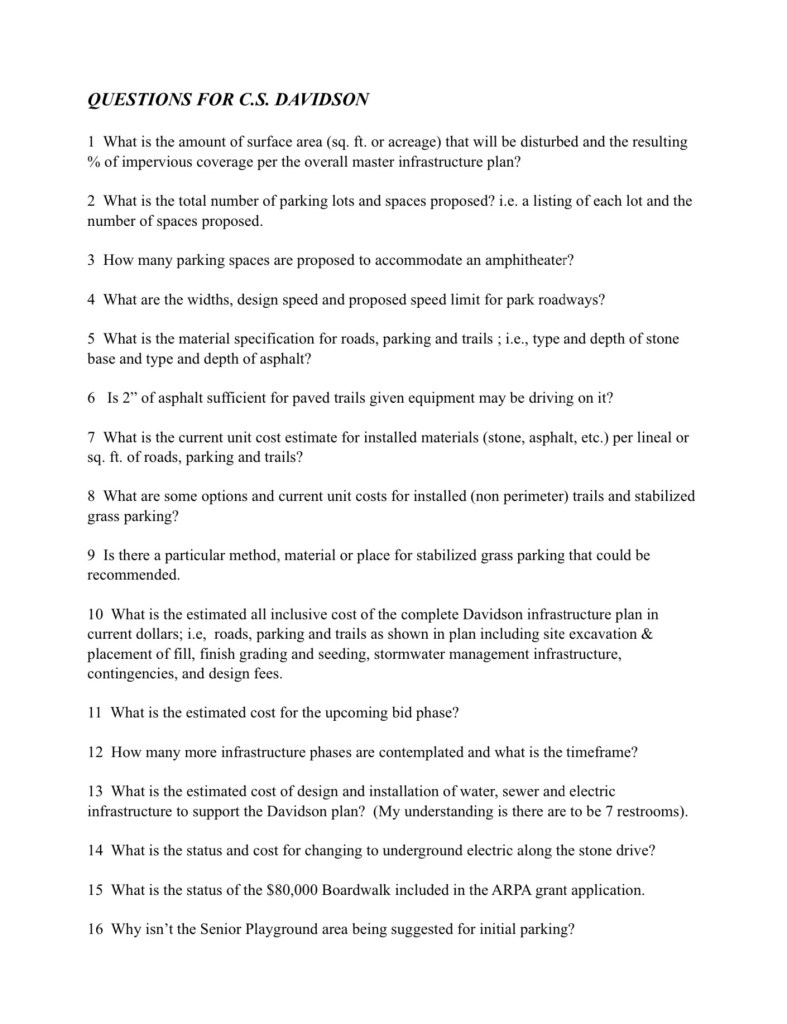 Despite my request as a Commissioner, township staff has failed to provide me with answers to 17 questions posed to C.S. Davidson. Per township procedure, board members are not to contact Davidson directly. All contact is to be through the Township Manager (Scott Fraser) who prefers communication with him be in writing.