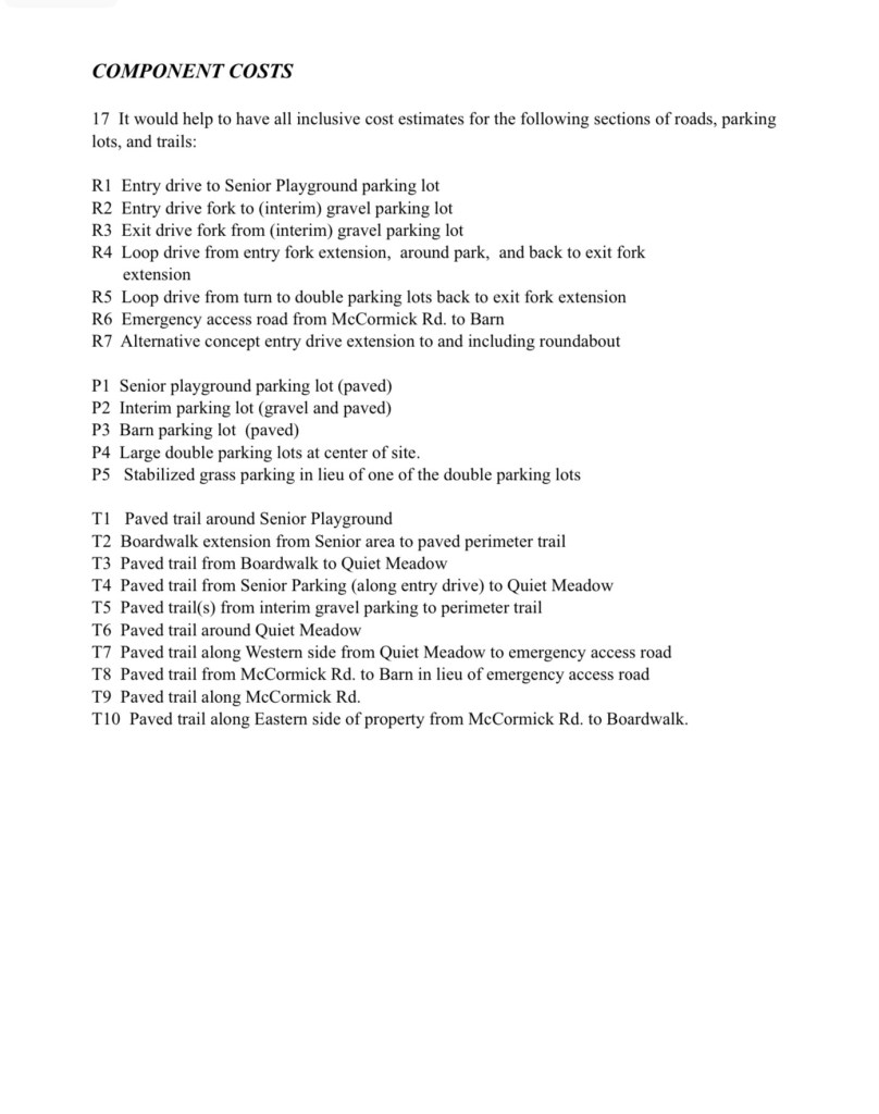 Even without response from staff or Davidson; it is clear that substantial $ could be saved by: minor changes to the entry drive, adding a roundabout, using pocket parking, eliminating a number of redundant trails, and using the former farmhouse driveway for emergency access to the barn.
