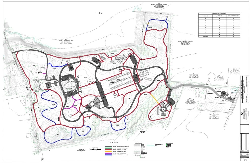 In studying the C. S. Davidson master plan (not shown on the township website) and its 547 parking space configuration, it becomes apparent that a soccer or lacrosse (turf) field could easily be placed on the indicated grass parking area in the future. See the area near the center with parking lines and parallel 8 ft. trails.