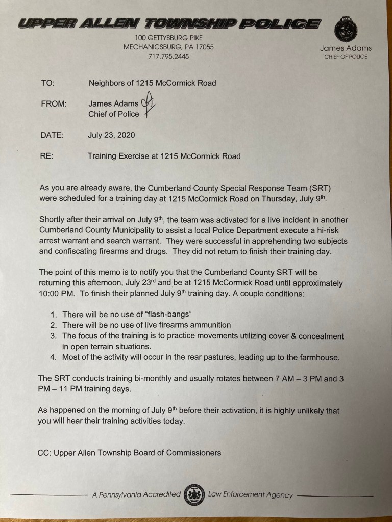 Early on in the Township ownership, there were police training drills using the farmhouse. Our understanding is the initial drill was to use “flash bangs” but this drill was postponed. From the BOC Minutes 05/06/20: