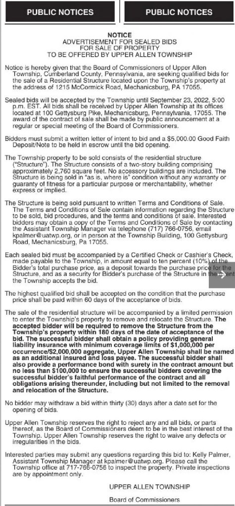 Ms. Palmer further states “As the August 22 Advertisement notes, the sale of the structure will be accompanied by limited permission to enter the structure. You may bring 2 quests with you who should be identified to the Township. Additional guests may be permitted at the discretion of the Township upon a showing of necessity”.
