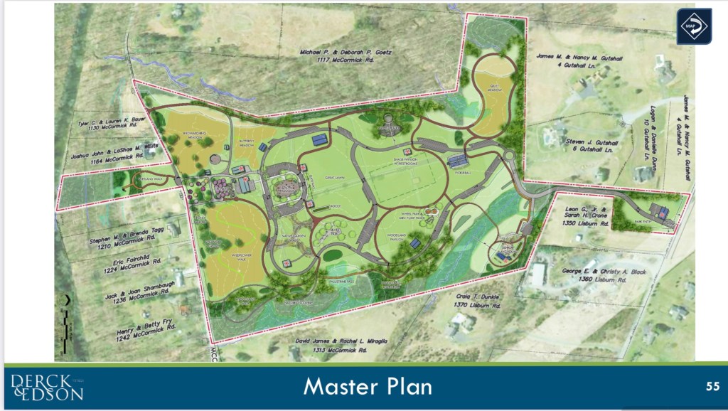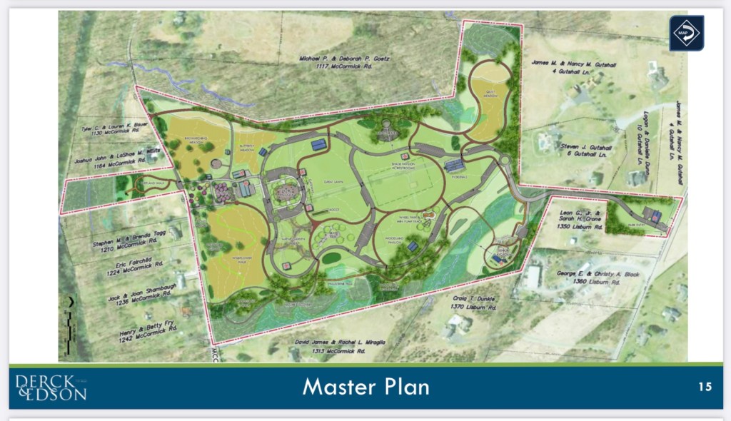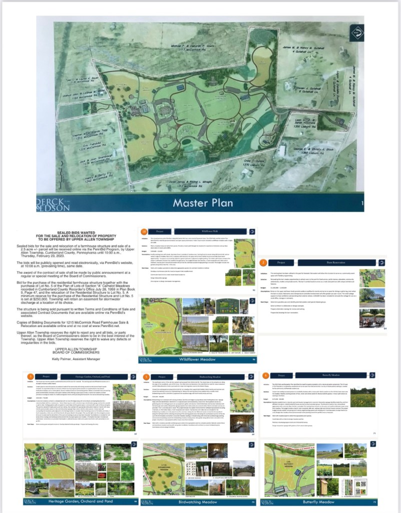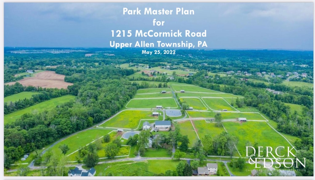 Hello Everyone. The Township has released the July 20, 2022 Master Plan presentation (attached below) by Derck & Edson which provide much needed detail for the farm/park now named “Upper Allen Generations Park” with an address of 1340 Lisburn Rd. It is helpful to go through the 43 slides for close up views of the various park areas and the planned amenities.