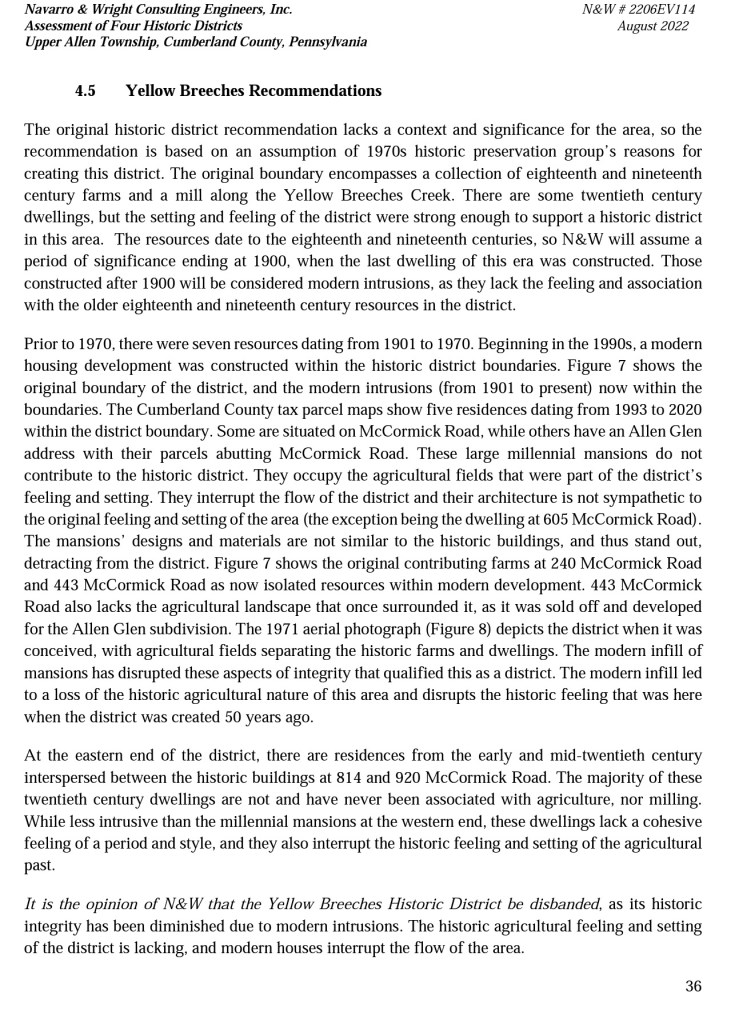 3 How do the Commissioners reconcile their view of historic significance with the 2013 Comprehensive Plan which states (pg 28) “Rehabilitate and preserve significant historic residential structures” and (pg. 30) “To support the identification and designation of properties of national, state, and local historic significance” and “To encourage the preservation, rehabilitation, and adaptive reuse of historic structures as identified in the 1976 publication, Early Architecture in Upper Allen Township, by the Upper Allen Heritage Committee and in Cumberland County’s historic structure inventory”