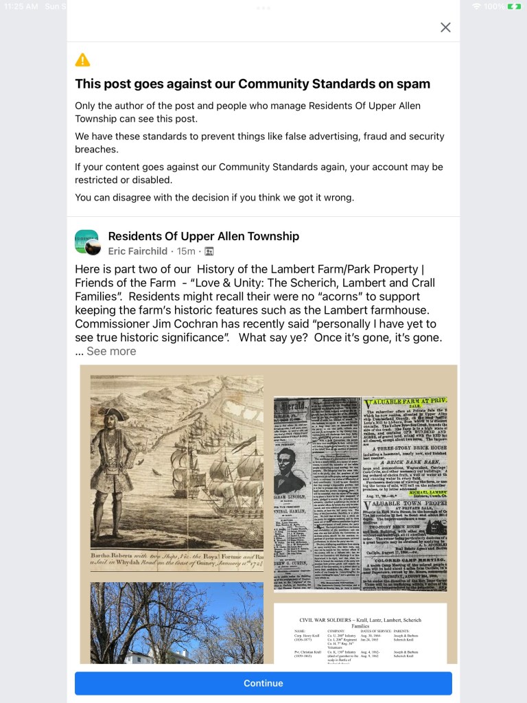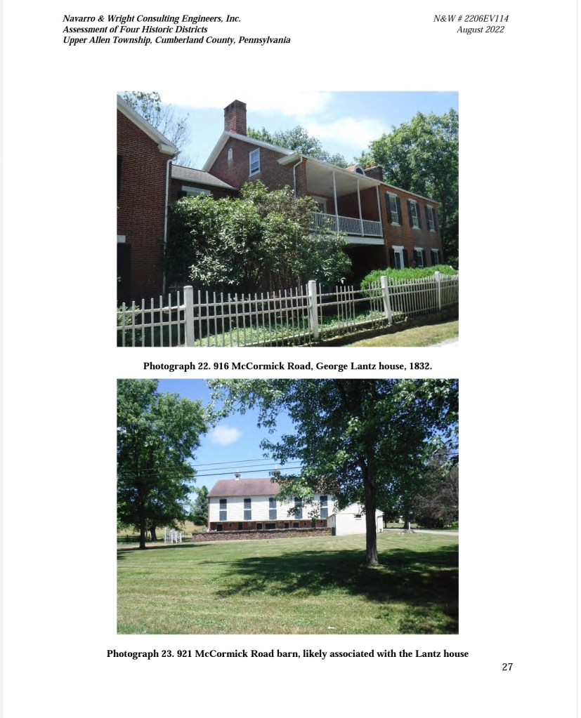We hope Michael and Mary Lambert are pleased. The Lamberts and the related Scherich, Crall and Lantz families built several of the beautiful farmhouses (and Glen Allen Mill) we see along McCormick and Lisburn Roads today. They also helped save the Union with 11 members of these four families serving in the Union Army during the American Civil War.