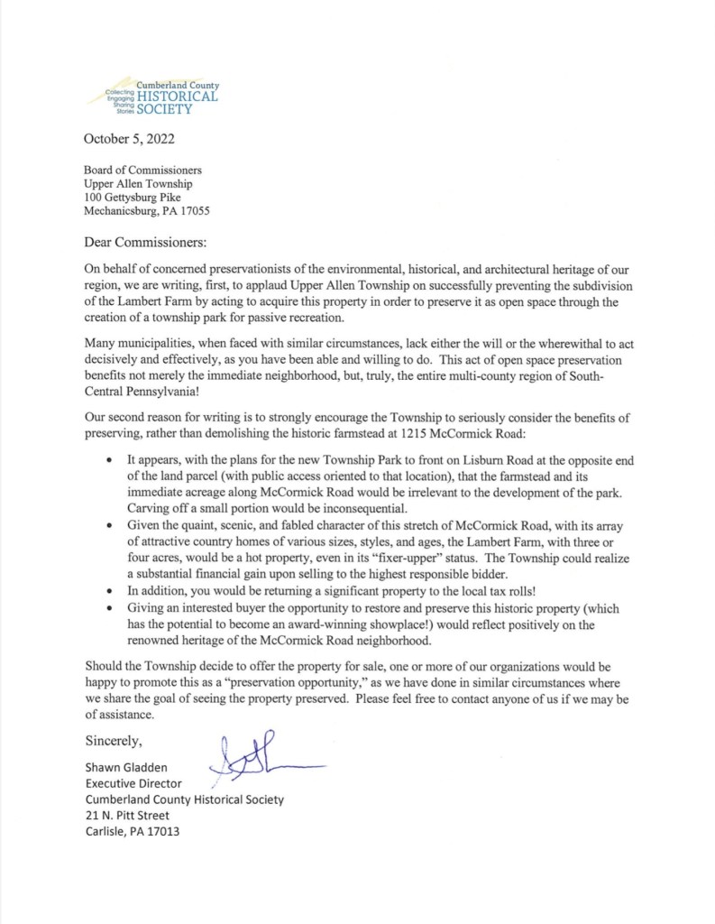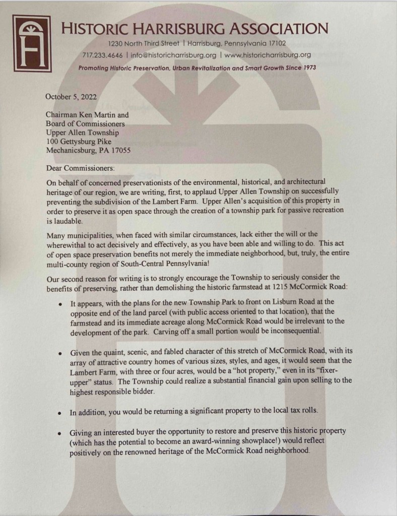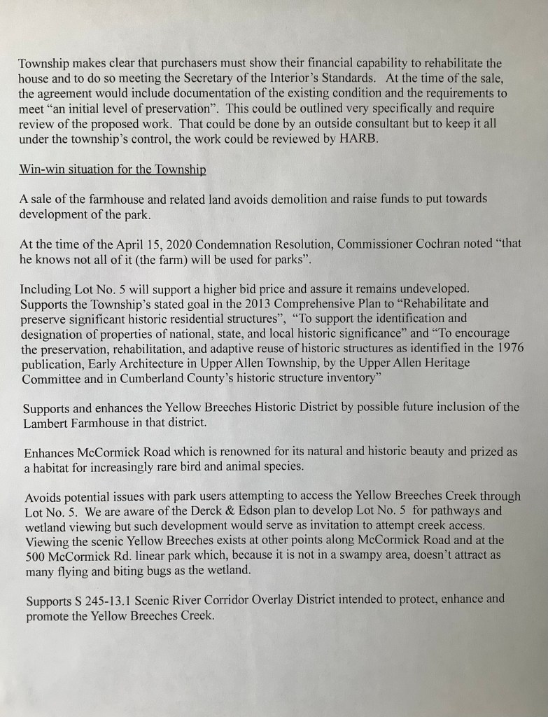 We all have opinions. My own opinion on the farm isn’t just because I live across the street from it. It’s based on research as shown on the Friends of the Farm website. Please consider the opinions expressed in letters of support we received from Preservation Pennsylvania, U.S. Congressman Scott Perry, Cumberland County Historical Society and Historic Harrisburg Association.