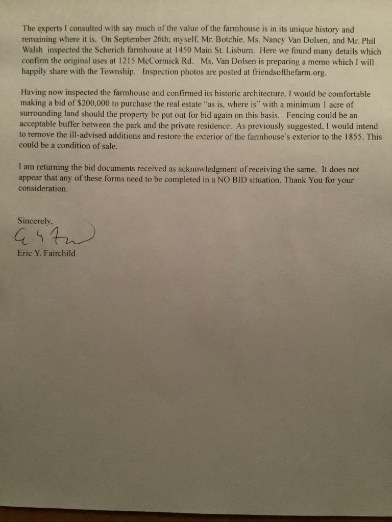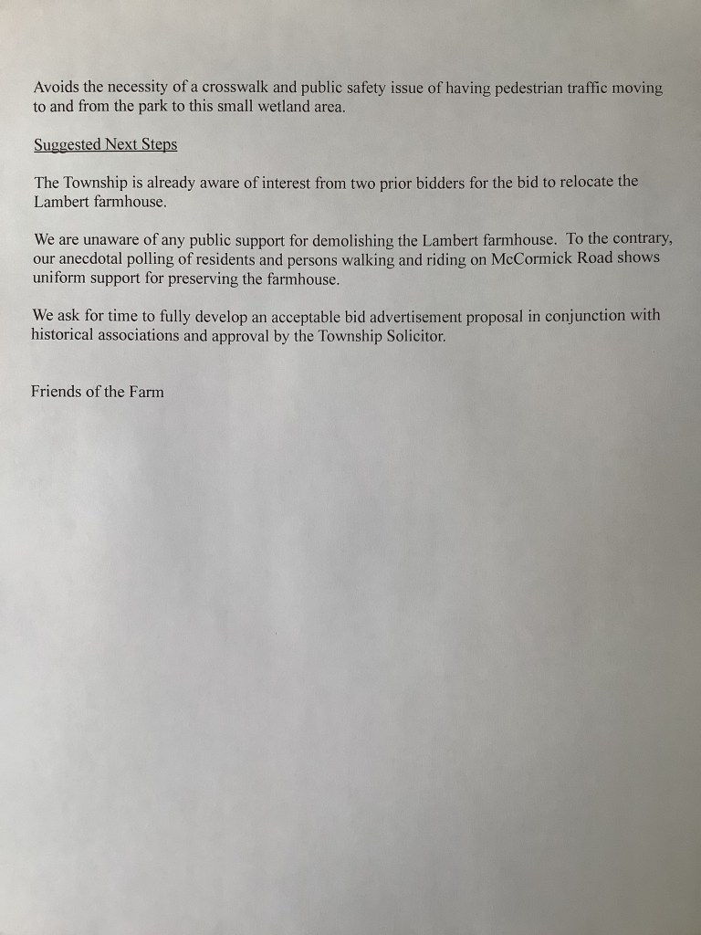 The 1855 Lambert farmhouse that the Commissioners wanted to destroy with “flash bangs” in July, 2020 will soon be sold for $250,001 and moved across McCormick Rd. This one Friends of the Farm suggestion saves a historic building and returns 22.7% of what the Township originally paid the farm ($1,100,000) while giving up about 3.7% of total acreage.