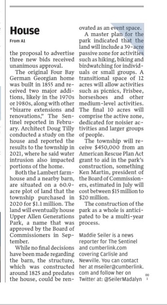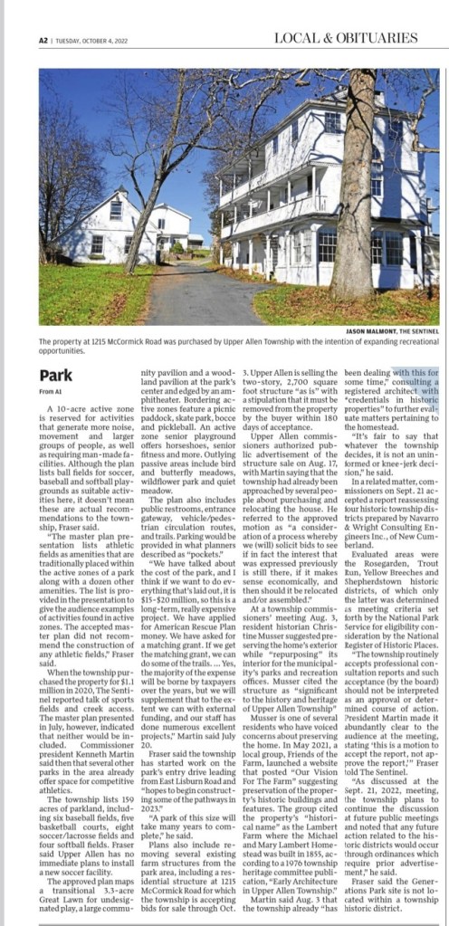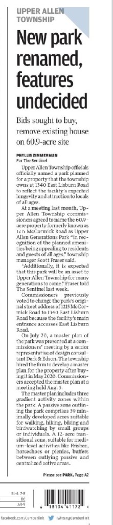 There is another BOC Meeting tonight which includes Item 7a Consideration/Approval of a name for the park. Meetings start at 6:30 pm. The Township suggested name is “Upper Allen Generations Park”.
