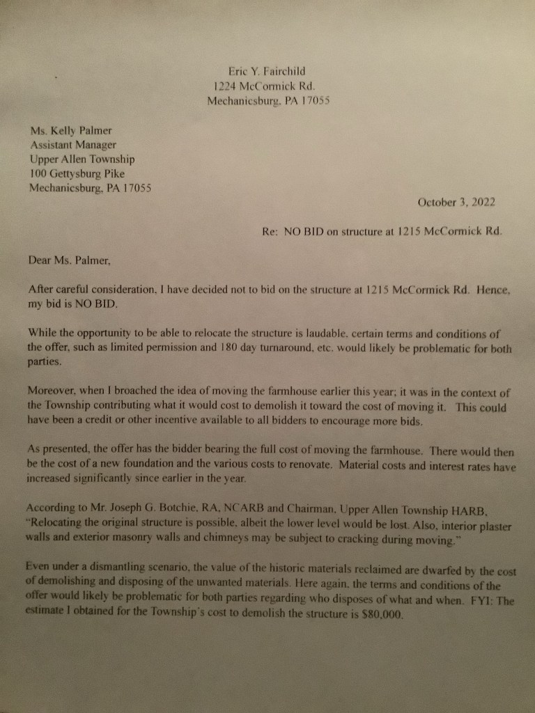 On September 9, 2022, Mr. Fairchild emailed Kelly Palmer (Assistant Township Manager) about scheduling two (2 hour) appointments to inspect the farmhouse per the Bid Advertisement to “remove and relocate the (Residential) Structure” at 1215 McCormick Rd. Bids are due September 23. Mr. Fairchild asked to possibly bring 2 members of the HARB, 2 neighbors who know McCormick Rd. houses, 1 contractor and the house mover(s). He also requested to be able to apply a chemical stripper to a small area of the exterior brick as a test for how easily the paint can be removed.