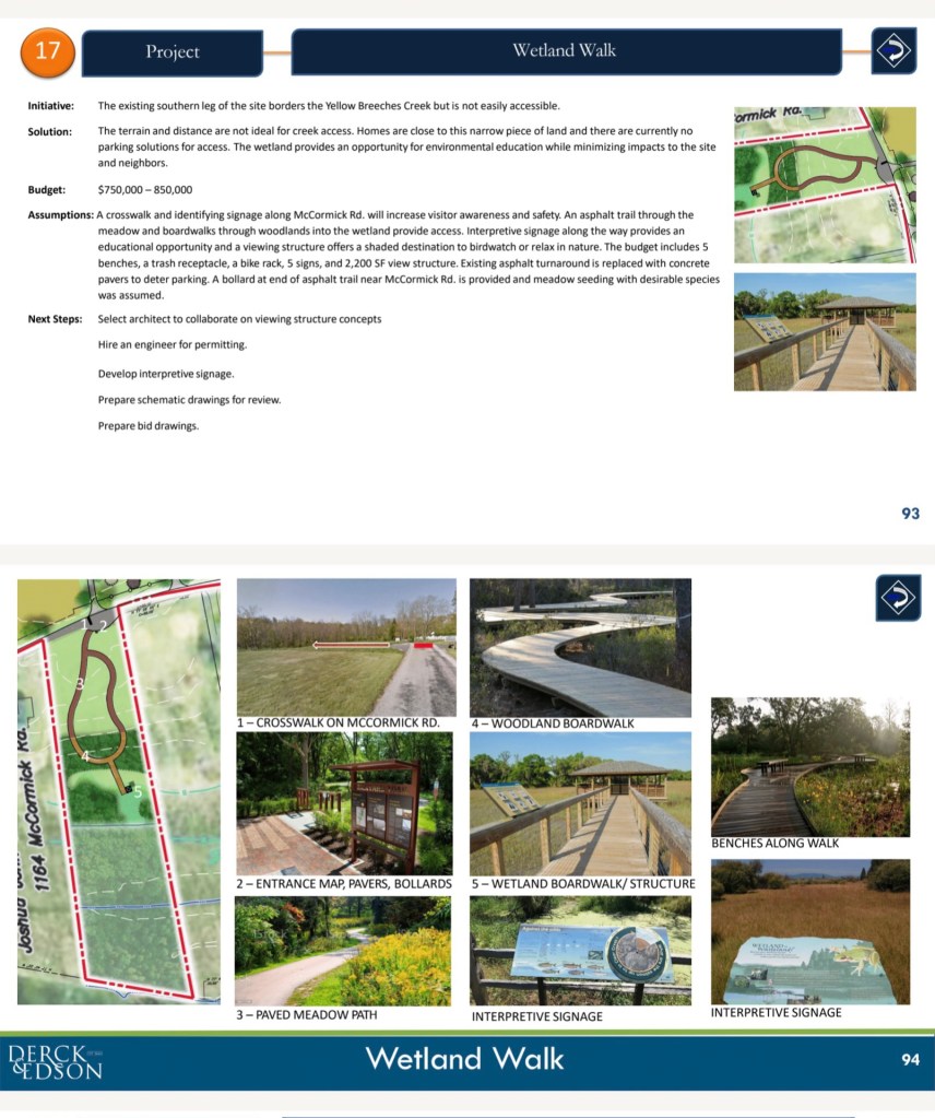 The Commissioners appear to be acting politically. One political reason could be that the Keystone FC Soccer proposal for a 9 field soccer complex and clubhouse in South Middleton Township is being “deflated” and a soccer complex could soon be said to be needed in Upper Allen. We sure don’t need 547 parking spaces at Generations Park to watch birds. Note that Jim Cochran previously motioned for a $9,110,000 bond issue including $2 million for an Upper Allen “turf facility” and “soccer complex”. See BOC Minutes 04/21/21 (pg. 24) and 05/19/21 (pg. 2).