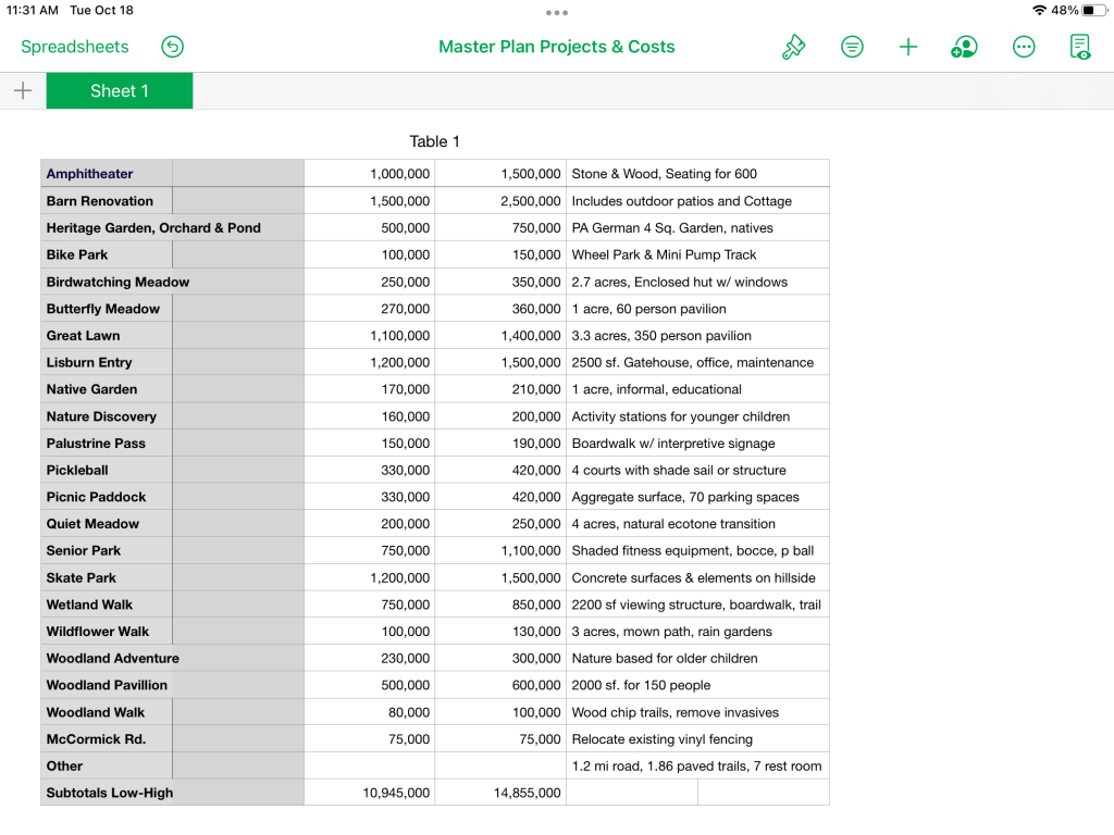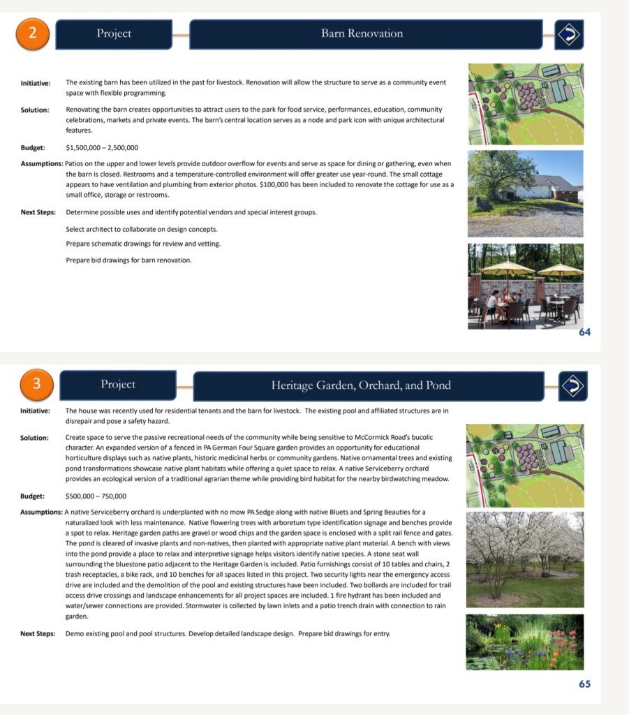 The sooner cost estimates for such amenities as Roadways, Trails, Gatehouse, 220 Parking Spaces, 7 Restrooms, Plantings, rehabbing the Barn, Skate Park, Pump Track, Amphitheater, etc. are provided, the better for all concerned. We suggest prioritizing and separating items based on wants and needs. The lack of budget numbers suggest the Board should proceed with caution.