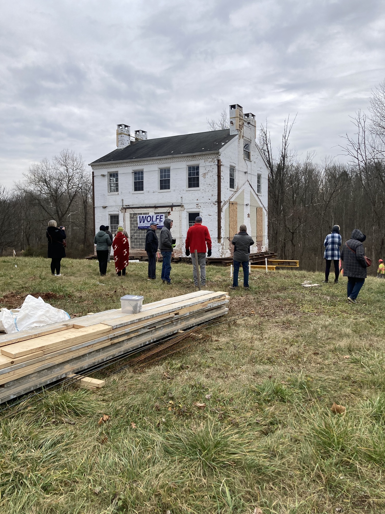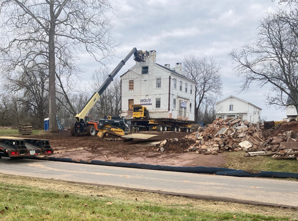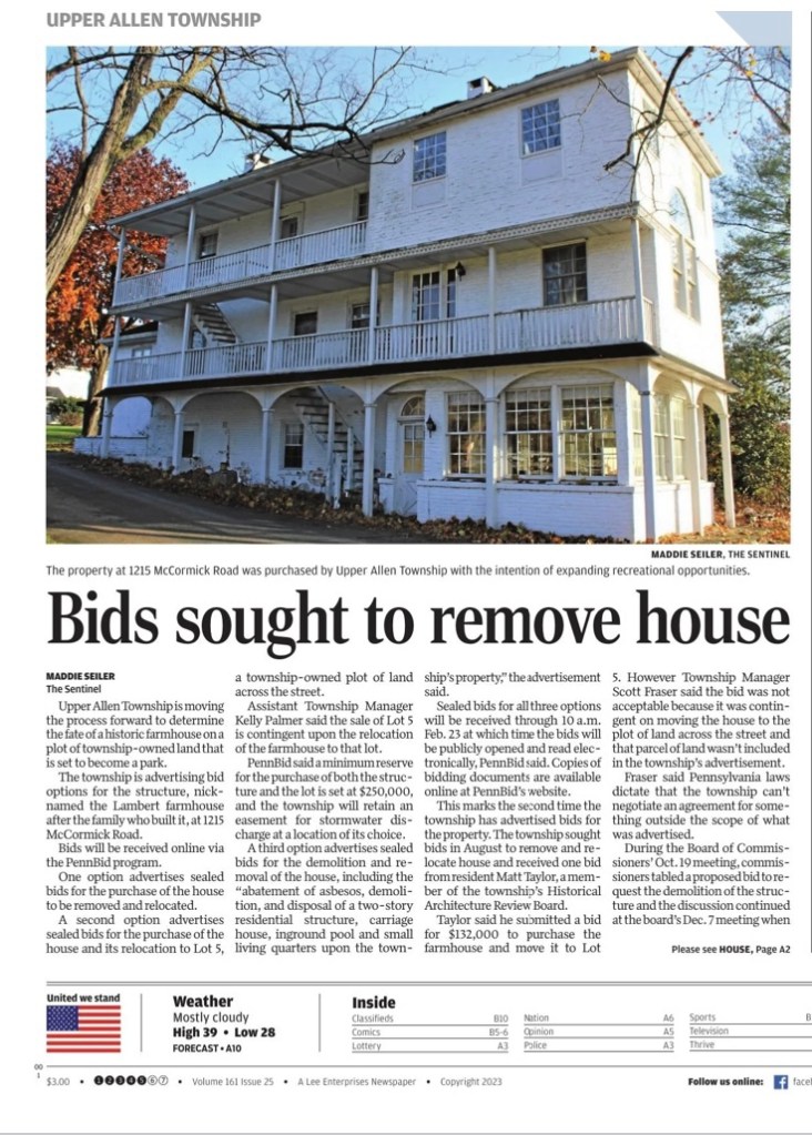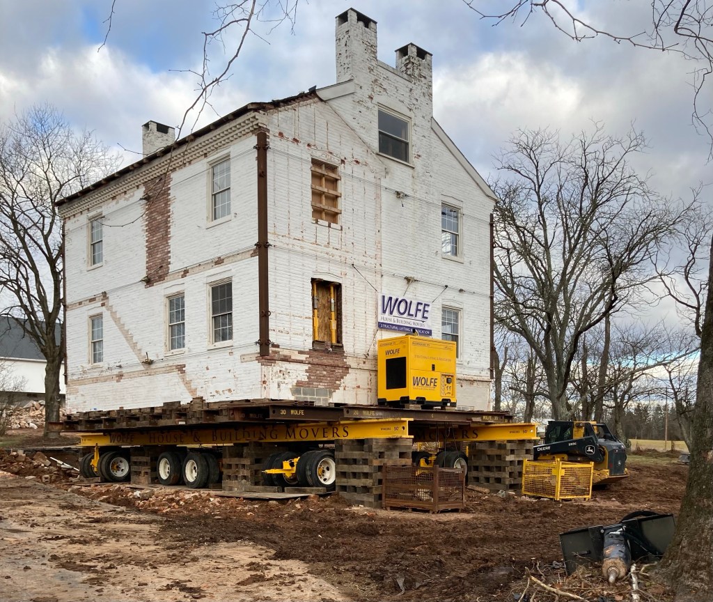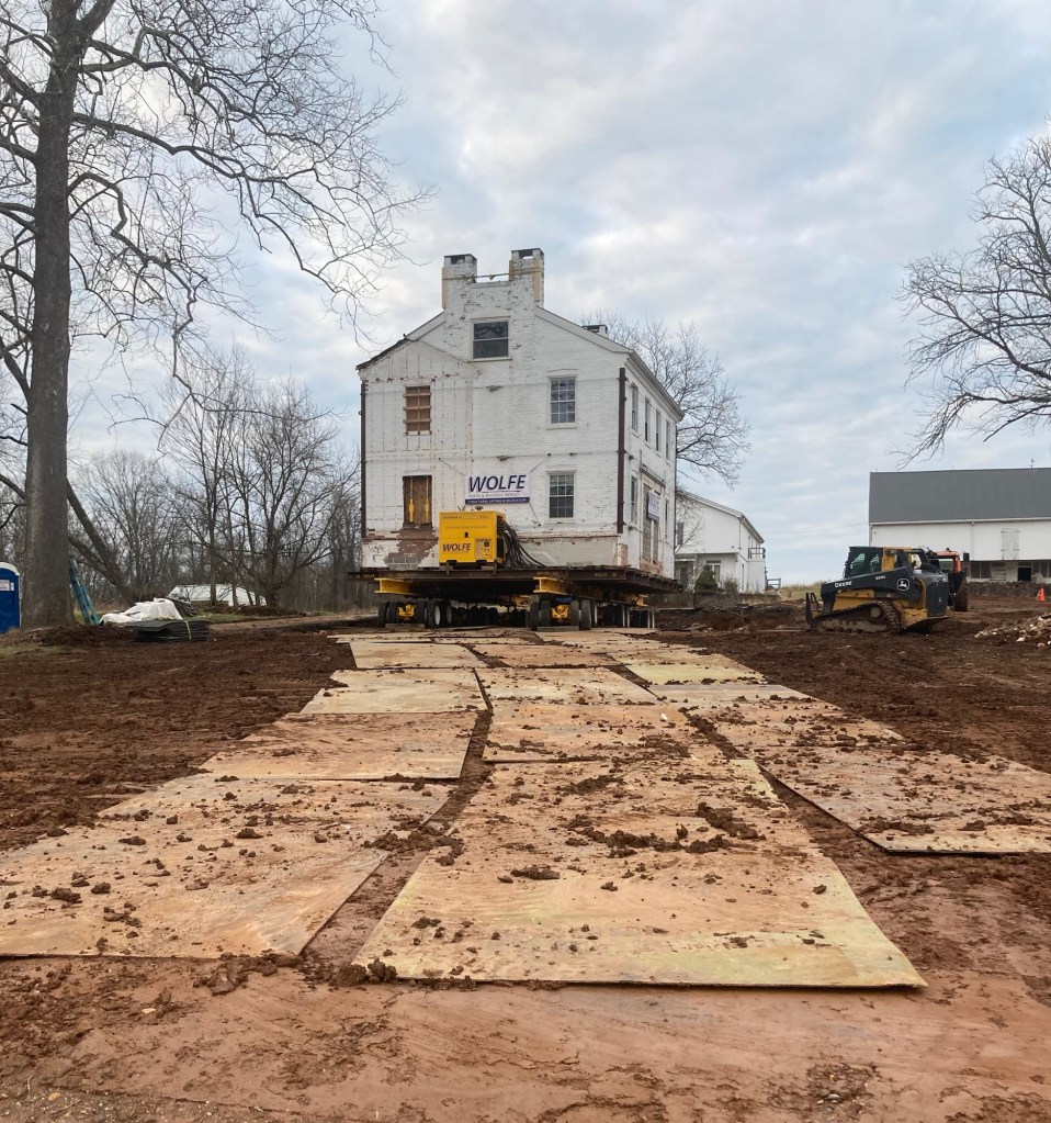 The Lambert farmhouse is now scheduled to be moved tomorrow, December 20, 2023. The dollies are in place underneath and there appears to be only some final grading left to do. Sorry, but we do not have an exact time for the move to begin. 9:00 – 10:00 am is our best guess. The move will take several hours. Folks wishing to watch the move are welcome to park at 1224 and 1236 McCormick Rd. or Lower Allen Community Park.