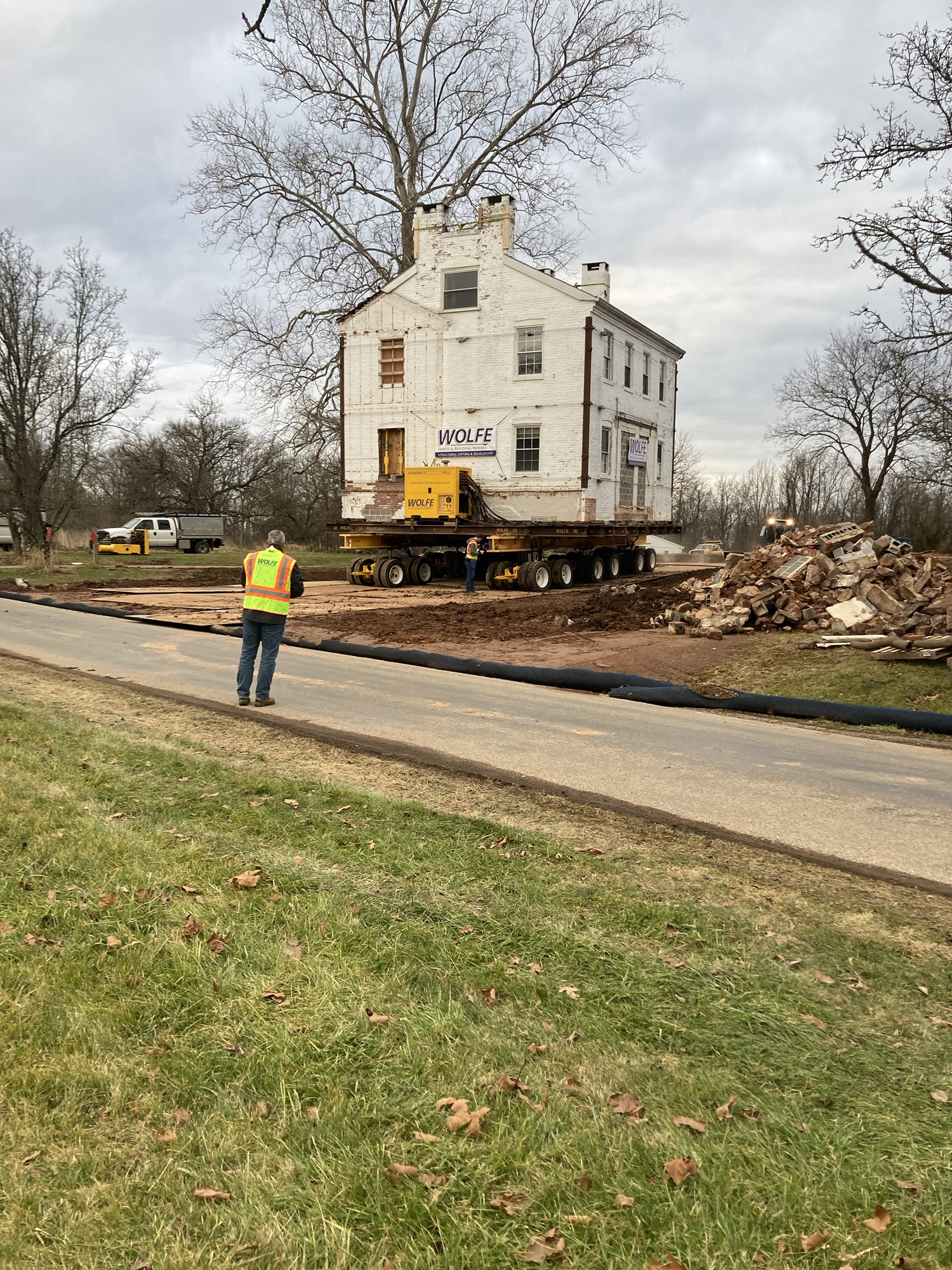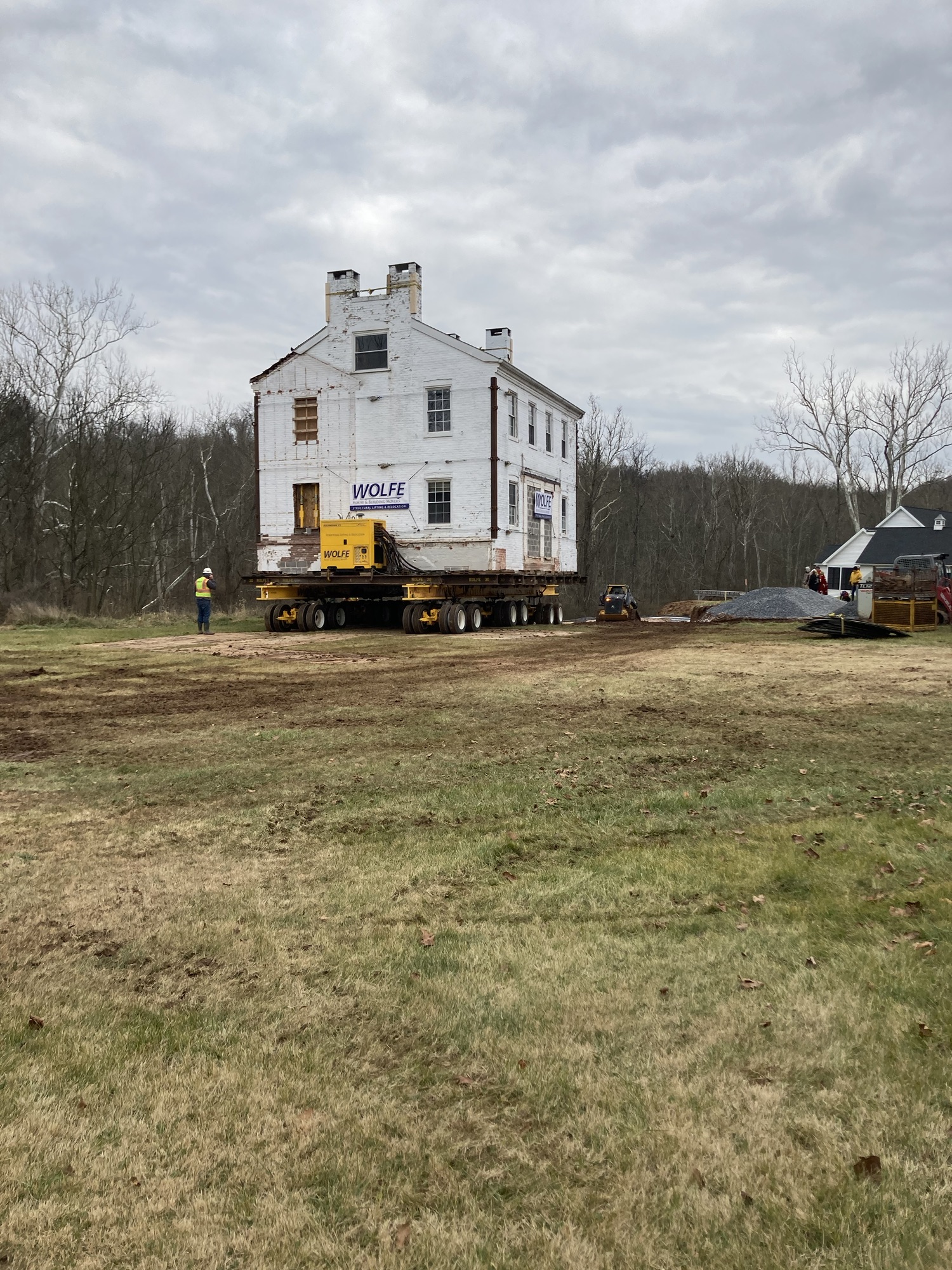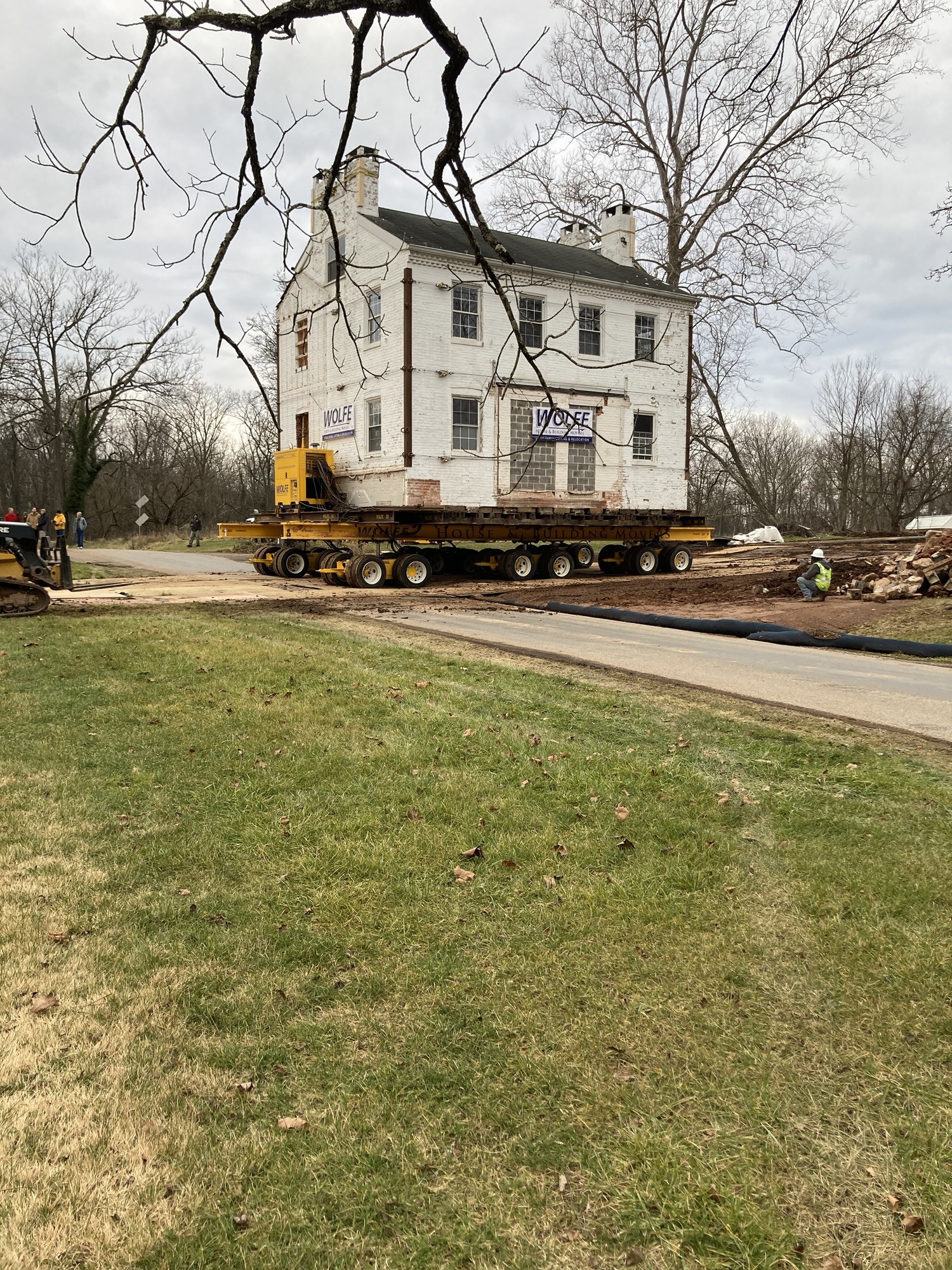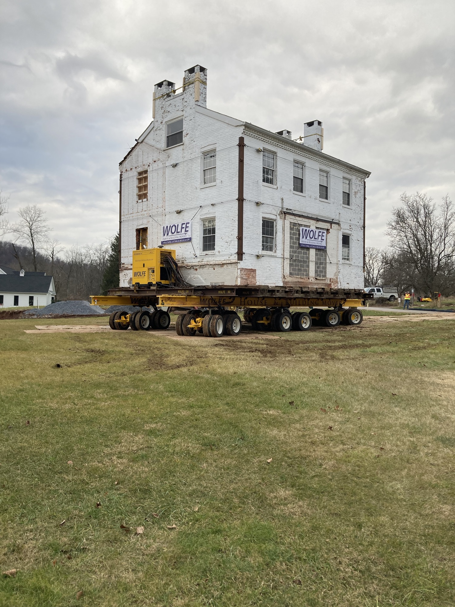 The Lambert farmhouse is now scheduled to be moved tomorrow, December 20, 2023. The dollies are in place underneath and there appears to be only some final grading left to do. Sorry, but we do not have an exact time for the move to begin. 9:00 – 10:00 am is our best guess. The move will take several hours. Folks wishing to watch the move are welcome to park at 1224 and 1236 McCormick Rd. or Lower Allen Community Park.