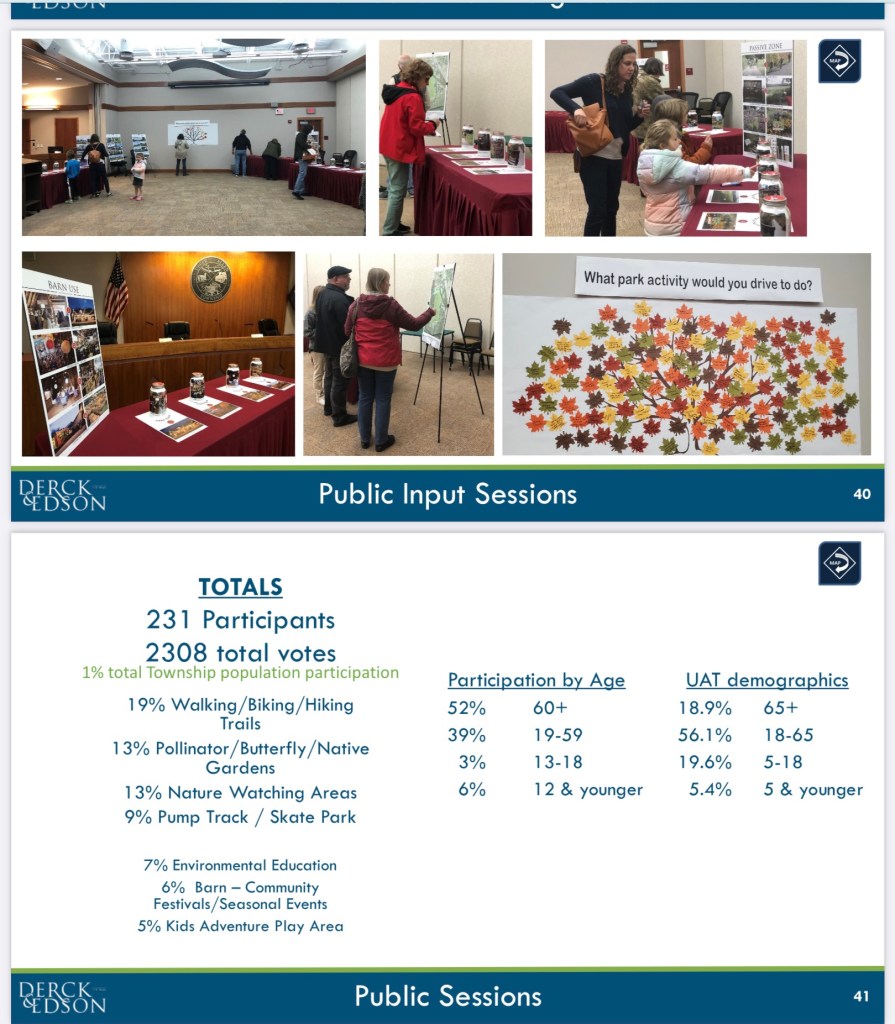 President Martin stated that this is a master plan, a roadmap of how it might be used and that it will not be built in five years or in his lifetime. He shared that this is an asset to the township and that we have the flexibility to build the park as we go. He opened the floor to comments about the park and master plan. He said that the Board of Commissioners would listen and take notes of input. He stated that the Commissioners want this to be as participatory as possible.
