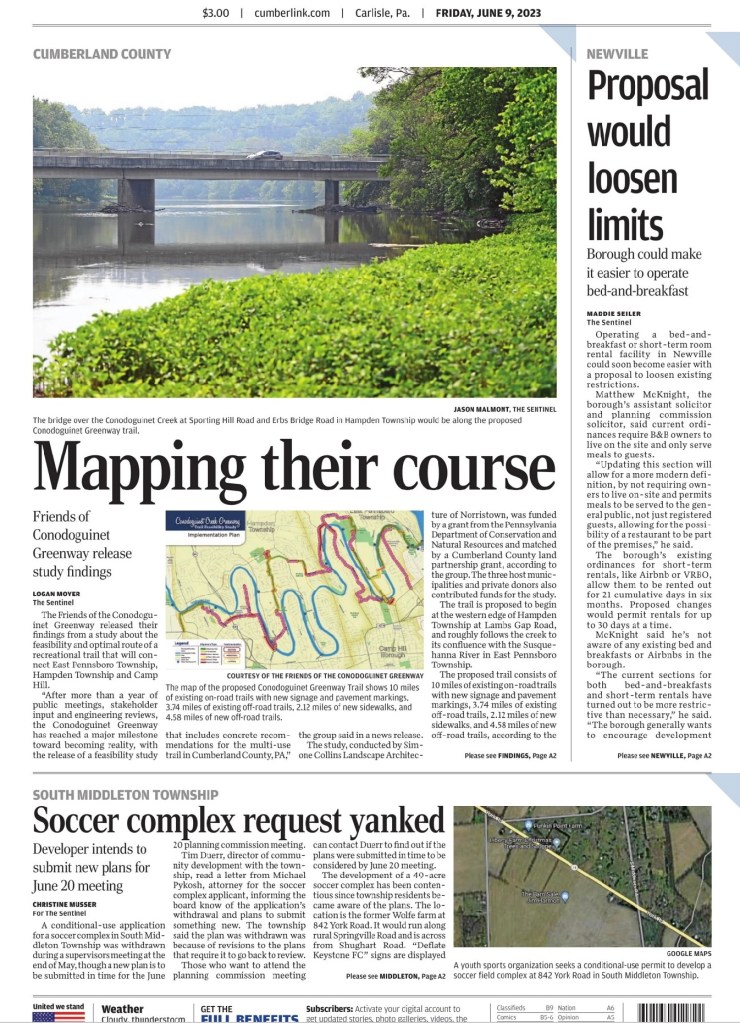 Note the “Mapping their course” story in the Sentinel about Friends of Conodoguinet advocating for a Greenway along the Conodoguinet. This is what forward thinking communities do. A greenway connection to Lower Allen Community Park was part of our original Friends of the Farm vision as well. This is also an Olmsted design principle; i.e., “When possible, public grounds should be connected by greenways and boulevards so as to extend and maximize park spaces”.