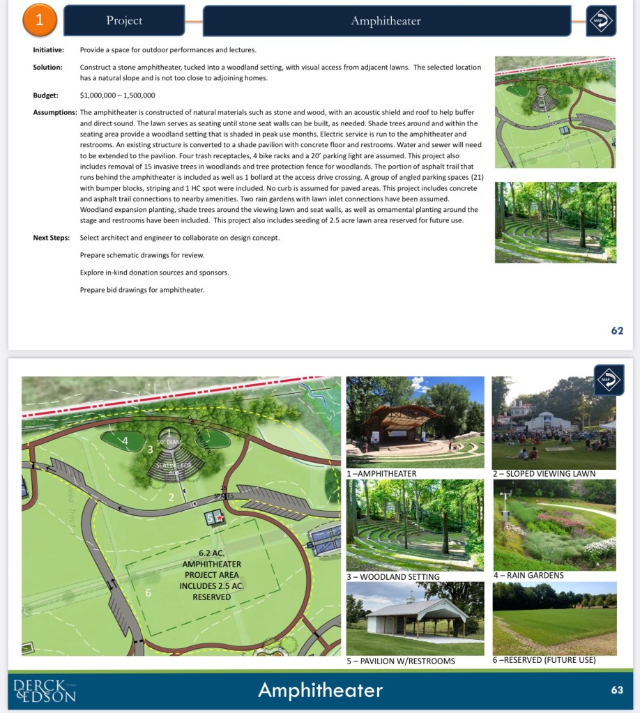 Movie nights at our parks apparently aren’t good enough. Nearby publicly supported venues like the West Shore Theatre in New Cumberland (which has an intensive schedule of movies, lectures, performances, etc.) apparently aren’t good enough. Upper Allen needs its own 660 seat outdoor amphitheater. And we need it here – on this 58 acre farm – in a spot where Friends of the Farm originally proposed “ice skating in winter at the low point in the meadow”.