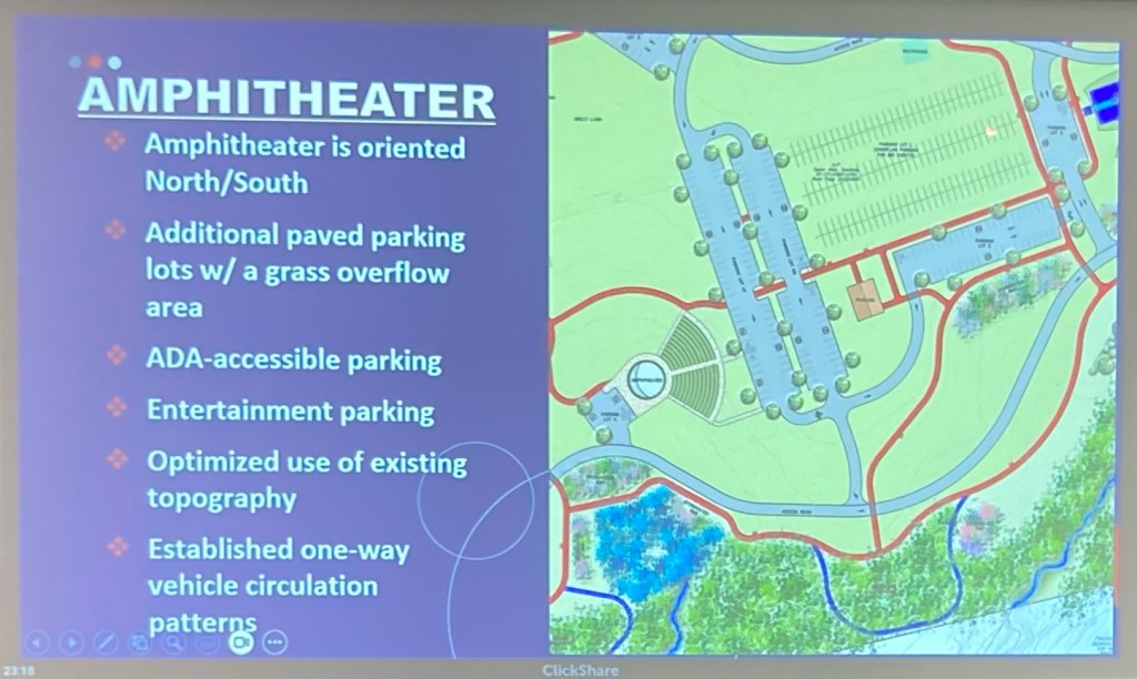 The C.S. Davidson version of the Master Plan is now being called the “Master Infrastructure Plan”. The driver for increased parking from 220 to 547 spaces is indeed the Amphitheater feature which pulled less than 5% of (acorn) votes at the November, 2021 public input sessions. The Derck & Edson design for an Amphitheater under tree cover has been shelved in favor of it being built in what is now an open meadow with North/South orientation.