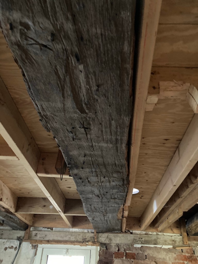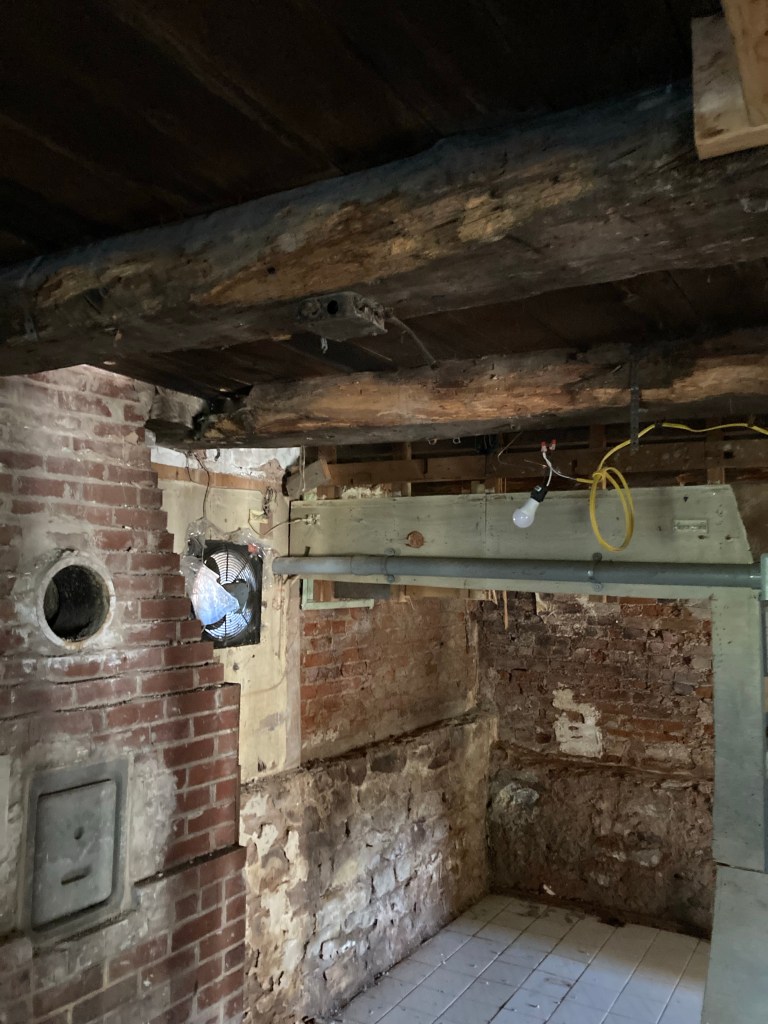 Entering the lower level under the “W.S. Scott 1789” beam now reveals large (10” x 10”) timbers overhead which were likely part of the original W. S. Scott log cabin. The two North bays of the four-bay structure may have been built over top of the original log cabin.