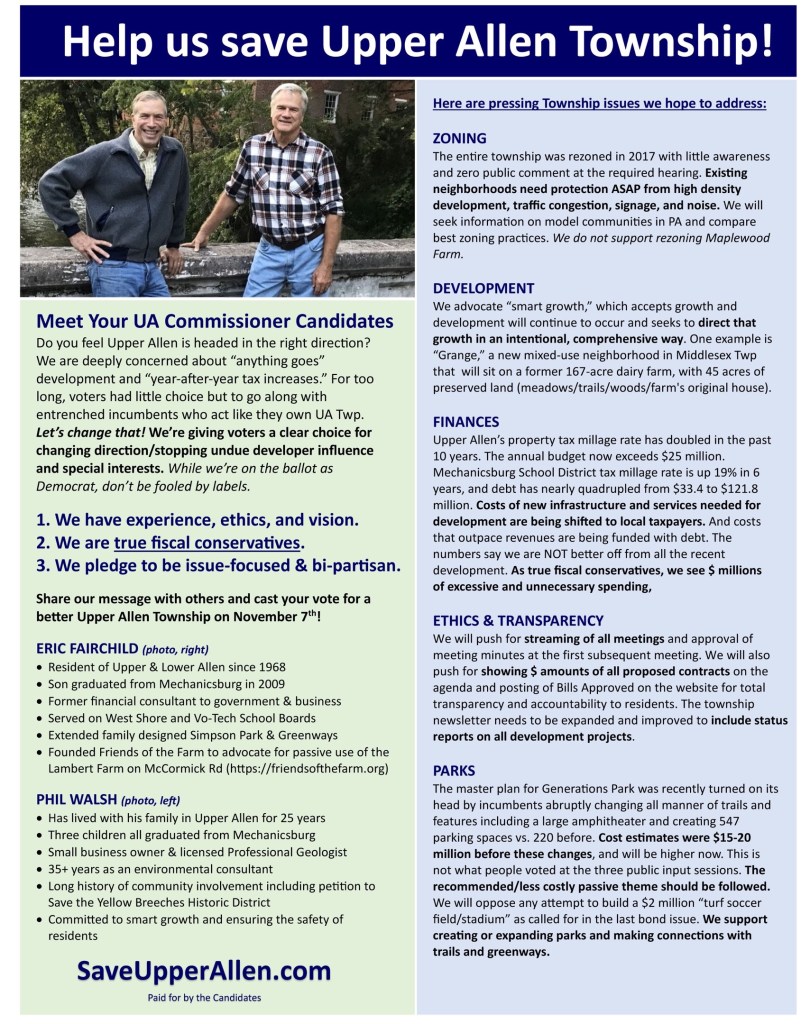 Through Friends of the Farm, the petition to Save The Yellow Breeches Historic, and regular attendance at Township meeting; Eric and Phil have met many who share their concern about the direction the township is taking. There are many issues and much is at stake on November 7th.