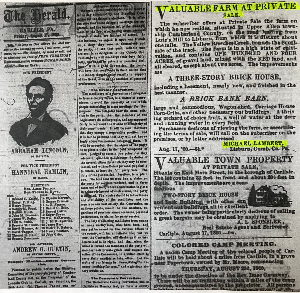 Photo Collage – February 2023 1850 Krall House 443 McCormick Rd. 1855 Lambert House 1215 McCormick Rd. 1852 Sherich House 1450 Main St. Lisburn Nov. 24, 1802 Carlisle Weekly Herald Glen Allen Mill 1879 Glen Allen Mill 2022 Aug. 17, 1860 Carlisle Weekly Herald Upper Allen Heritage Committee 1976 Yellow Breeches Gazette Press 2020 Full Site Master Plan Barn Renovation Project Heritage Garden, Orchard and Pond Project Birdwatching Meadow Project Butterfly Meadow Project Wildflower Meadow Project 01/17/23 Bid Advertisement Farmhouse Relocation Plan